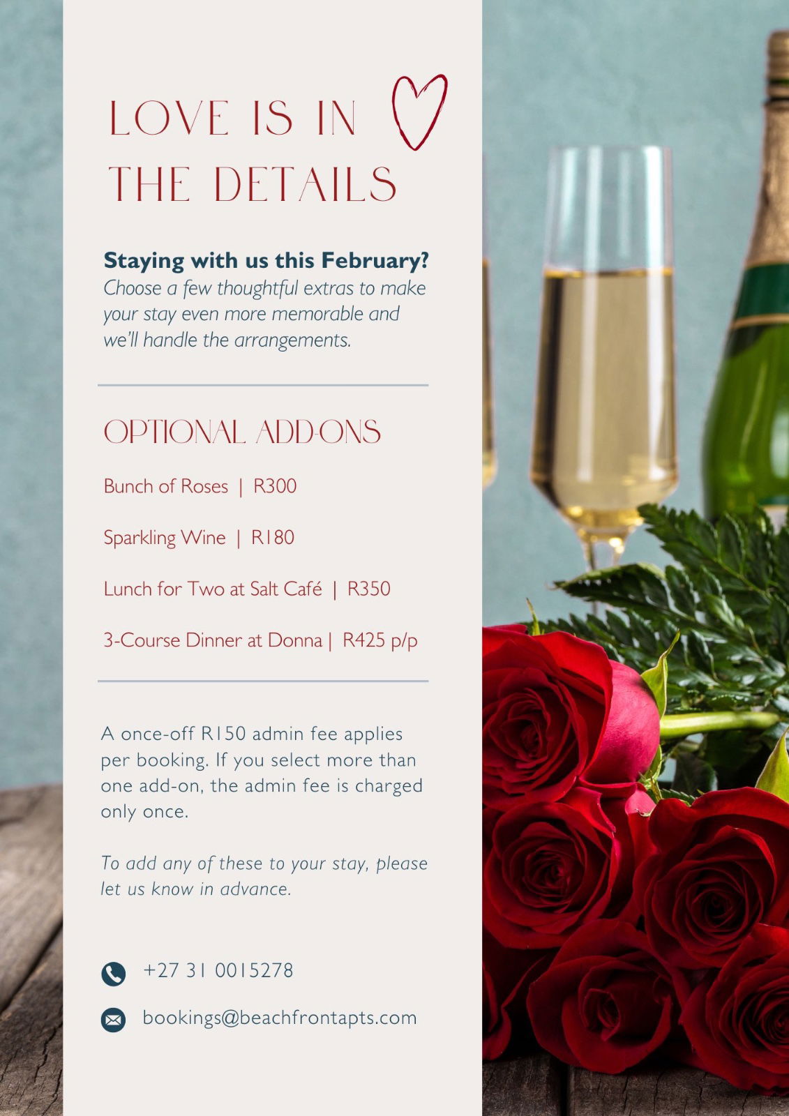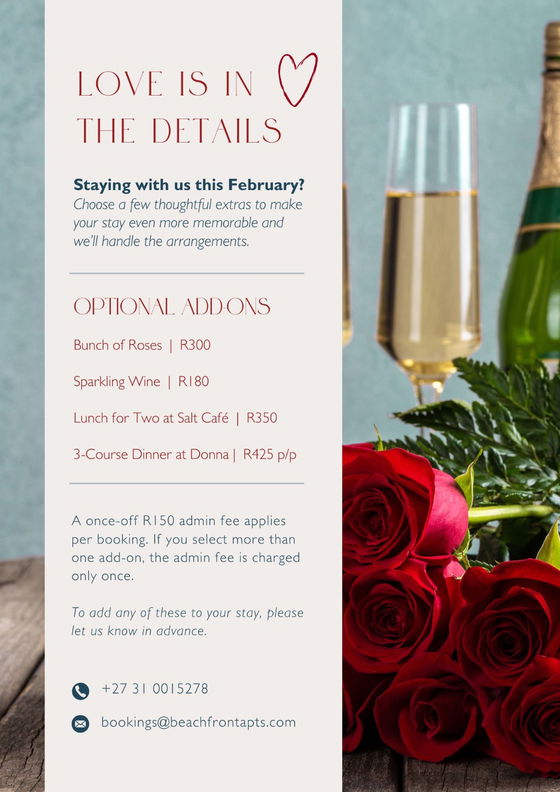 A once-off R150 admin fee applies per booking. If you select more than one add-on, the admin fee is charged only once. Payment will be required upfront when placing the order.